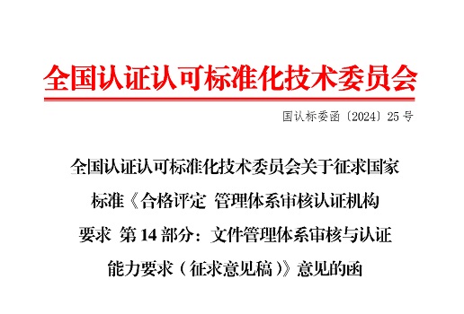 通知公告丨国家标准《合格评定 管理体系审核认证机构要求 第 14 部分:文件管理体系审核与认证能力要求》(计划编号:20231610-Z-469)征求意见